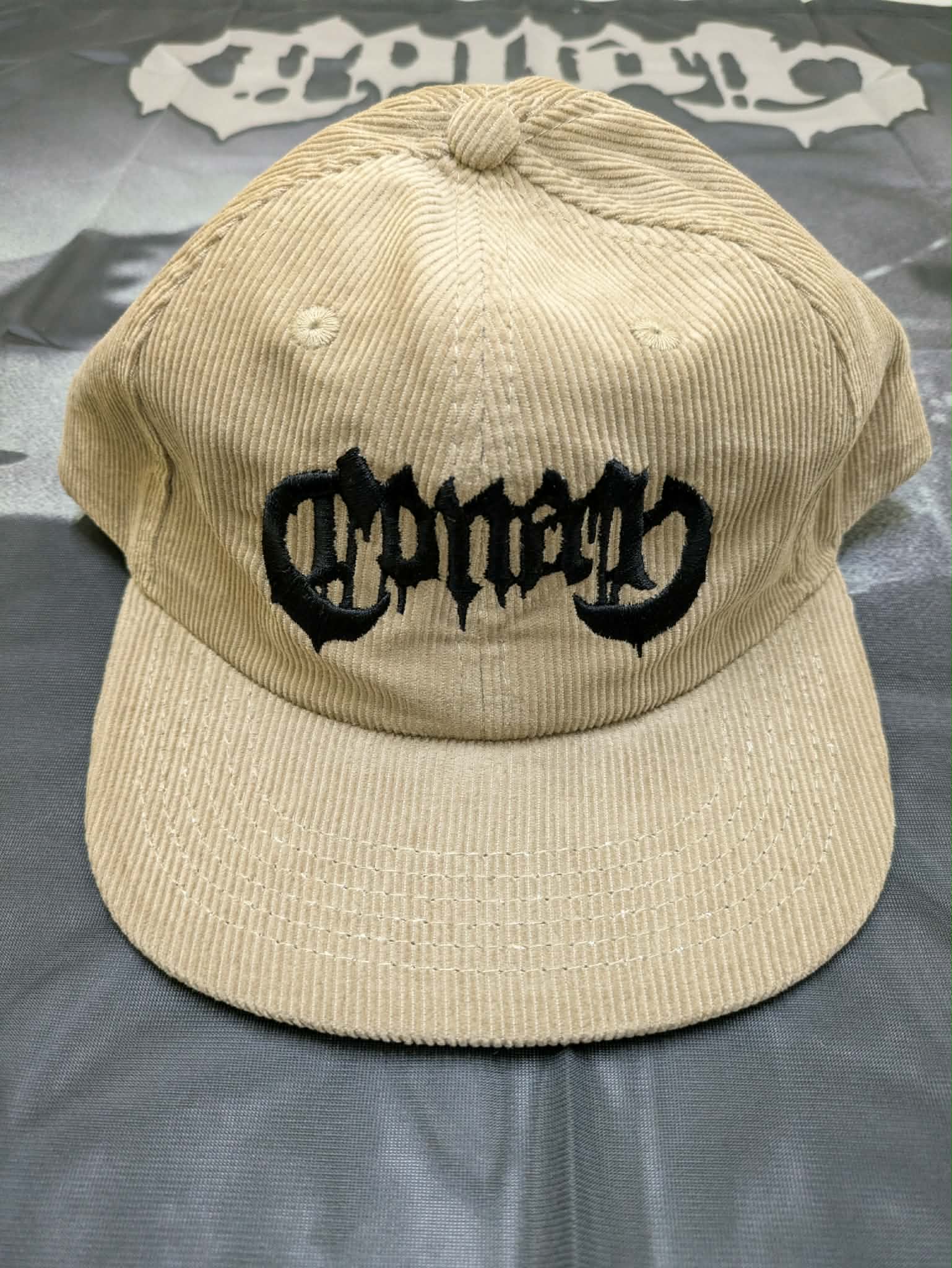 Corduroy hats, printed 'CONAN' logo. Embroidered logo.
